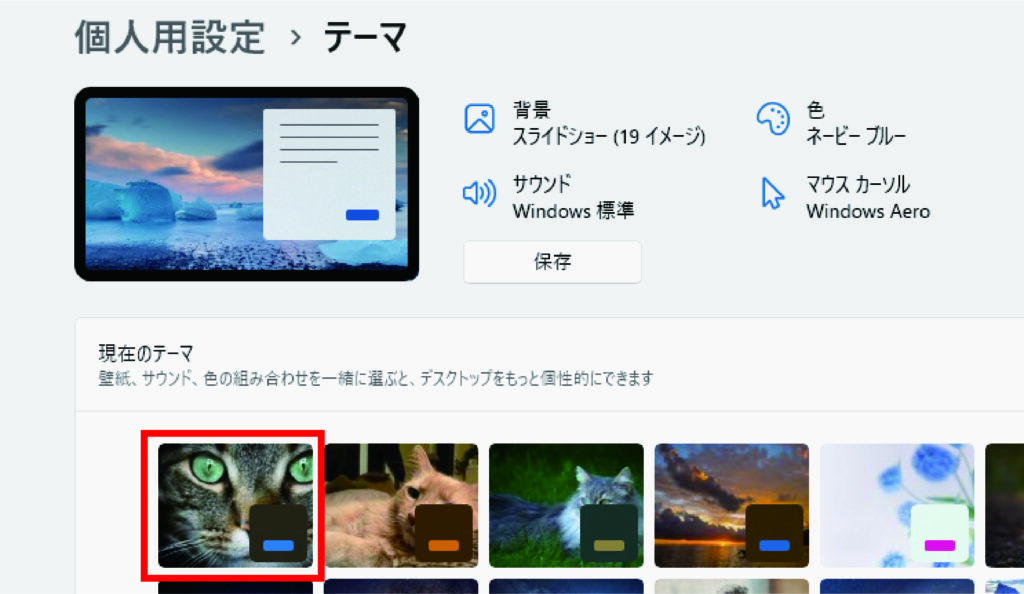 ※ここには、Windows11に用意されているテーマ以外に、インターネットからダウンロードしたテーマなども表示されている場合があります。