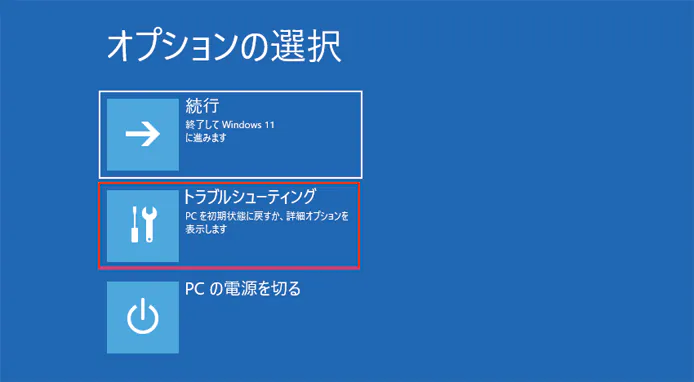 ②「オプションの選択」の画面が表示されるので、「トラブルシューティング」をクリックします。