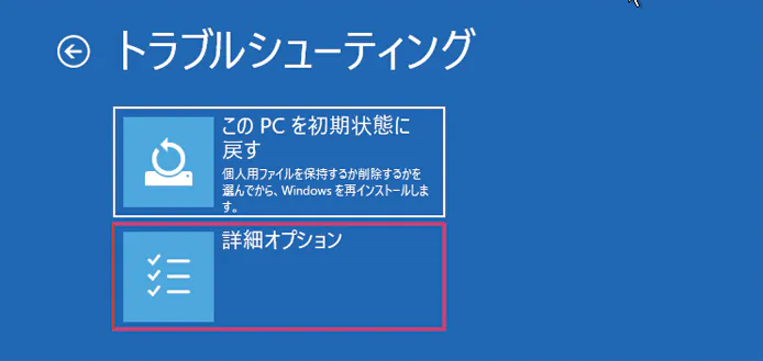 ③「トラブルシューティング」の画面から、「詳細オプション」をクリックします。