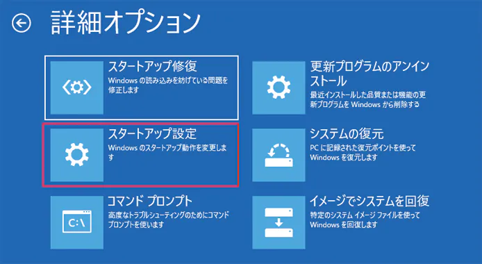 ④「詳細オプション」の画面から、「スタートアップ設定」をクリックします。