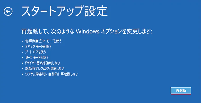 ⑤「スタートアップ設定」の画面から、「再起動」のボタンをクリックします。