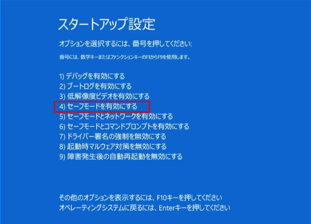 「 4)セーフモードを有効にする」を選択するので、数字キーの4をクリックします。