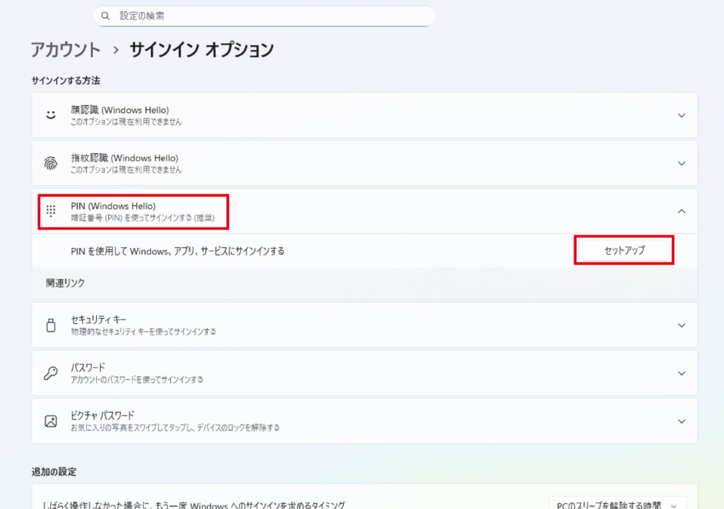 ※サインインパスワードを設定せずにローカルアカウントを使用している場合は、PINコードを設定することはできません。