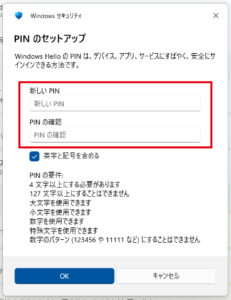 【5】登録したいPINコードを入力後、「OK」をクリックします。