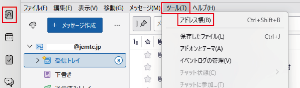 ①画面左の「アドレス帳アイコン」または、「ツール」→「アドレス帳」をクリックしてアドレス帳を表示させます。