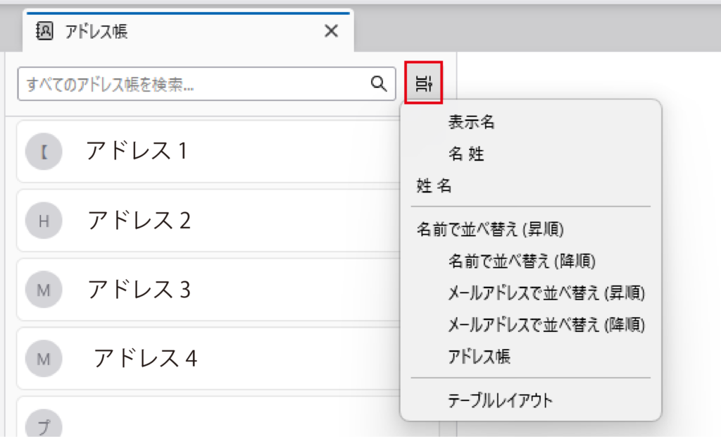 ②アドレス帳はの赤枠のマークをクリックし、表示された中から並び替え順序をクリックして頂ければ、表示順を好きなように変更出来ます。