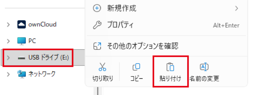 ②USBメモリーを右クリックで選択し、「貼り付け」でUSBメモリ内にデータを入れていきます。