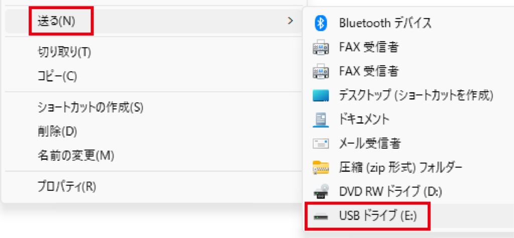 ②表示された中から「送る」→「USBドライブ」を選択してもコピーが可能です。