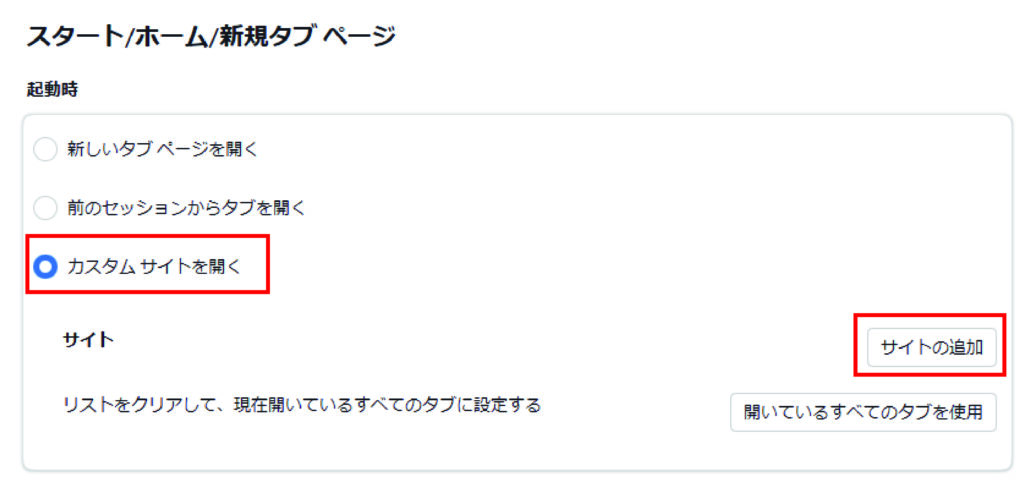 ④【カスタムサイトを開く】を選択し、【サイトの追加】から設定したいページのURLを入力します。