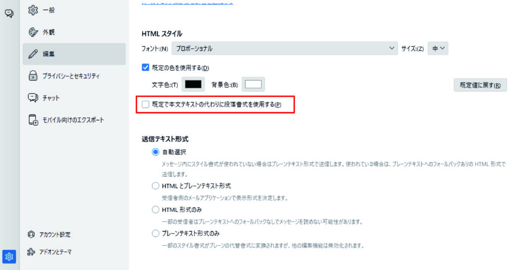 サンダーバードではメール文を入力した際に行間が広く空いてしまう場合があります。行間を狭くする操作方法は以下になります。
