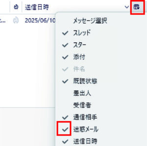 また、項目がない場合は、項目メニューから「迷惑メール」を選択すると表示されます。