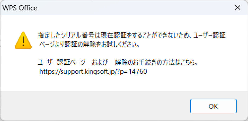 WPS Officeを起動した際に、以下のエラーメッセージが表示される場合は「すぐに認証」をクリックしてください。