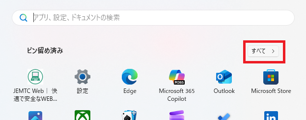 スタートメニューから「すべて >」を左クリックします。
