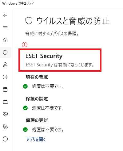 ①の部分にご自身でインストールしているセキュリティソフトが表示されるので、インストールしているセキュリティソフトでウィルスチェックを行ってください。(記載のソフト名は例になります。)