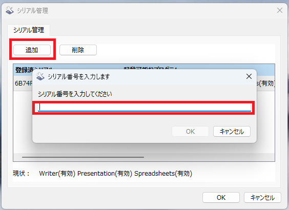 シリアル管理画面が開くので「追加」からお持ちのシリアルナンバーを入力します。